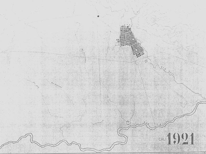 Mapa que indica con color negro la expansión de la ciudad en 1921. Santiago de cali, 1921.
