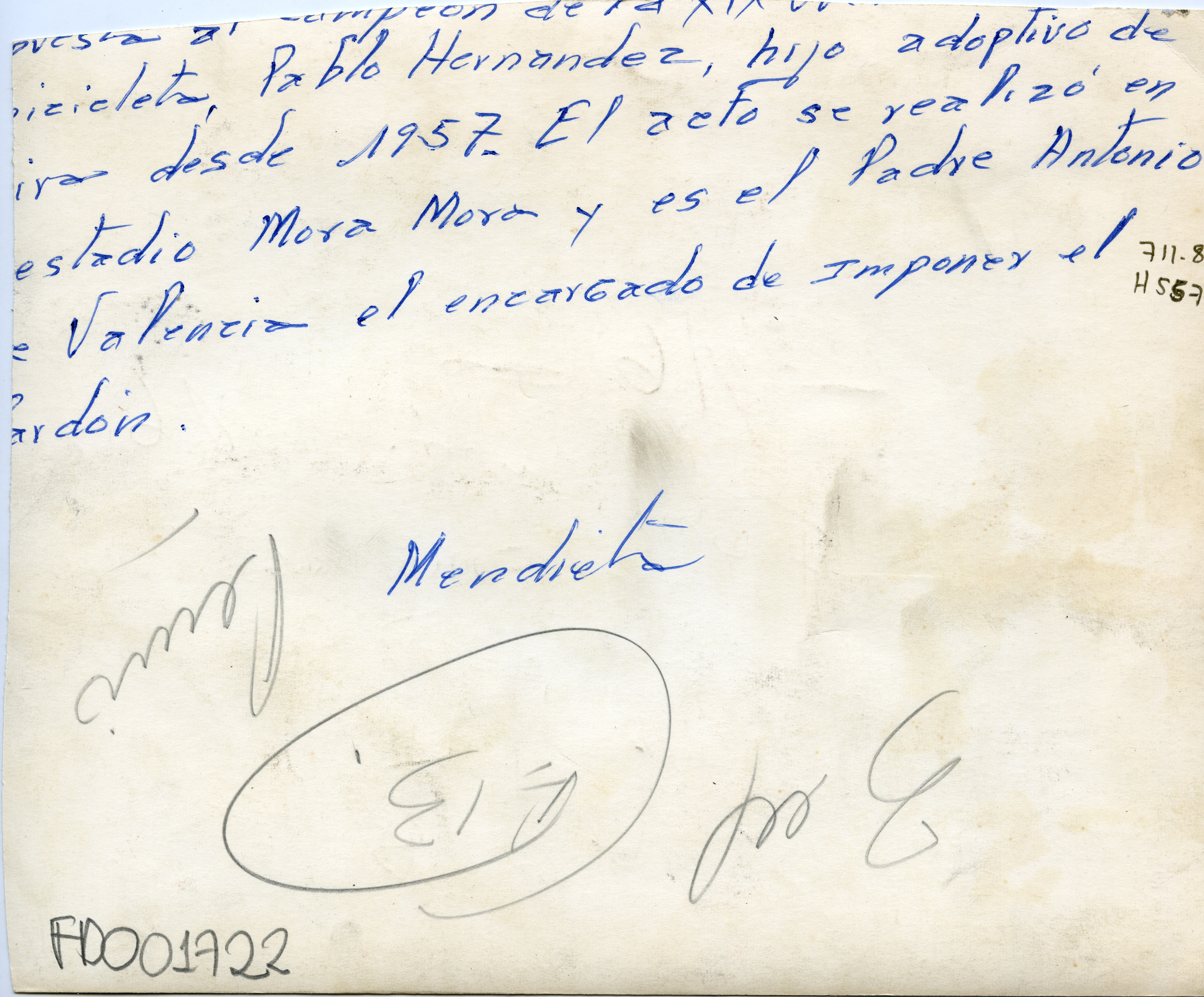 Al reverso de la fotografía doce en manuscrito: "icicleta, Pablo Hernandez, hijo adoptivo de(…) ira desde 1957. El acto se realizó en (…) estadio Mora Mora y es el Padre Antonio (…) e Valencia el encargado de imponer el ardón."