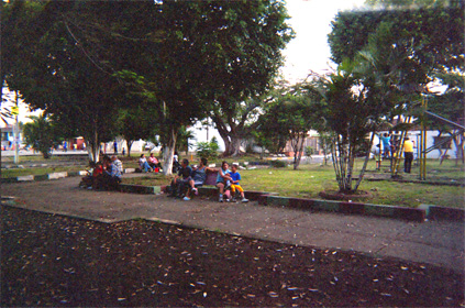 Plano general. Parque de barrio. Infantes y adultos disfrutando del atardecer. Predominio de vegetación. En primer plano hojas secas sobre el pavimento.