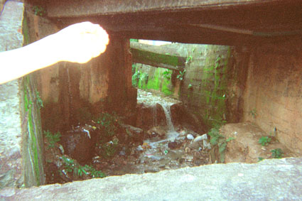 Plano Medio. Imagen tomada en exterior, donde se puede apreciar un riachuelo, canalizado en concreto. Al extremo izquierdo se destaca en un primer plano una mano sobre la que se refleja la luz del flash.