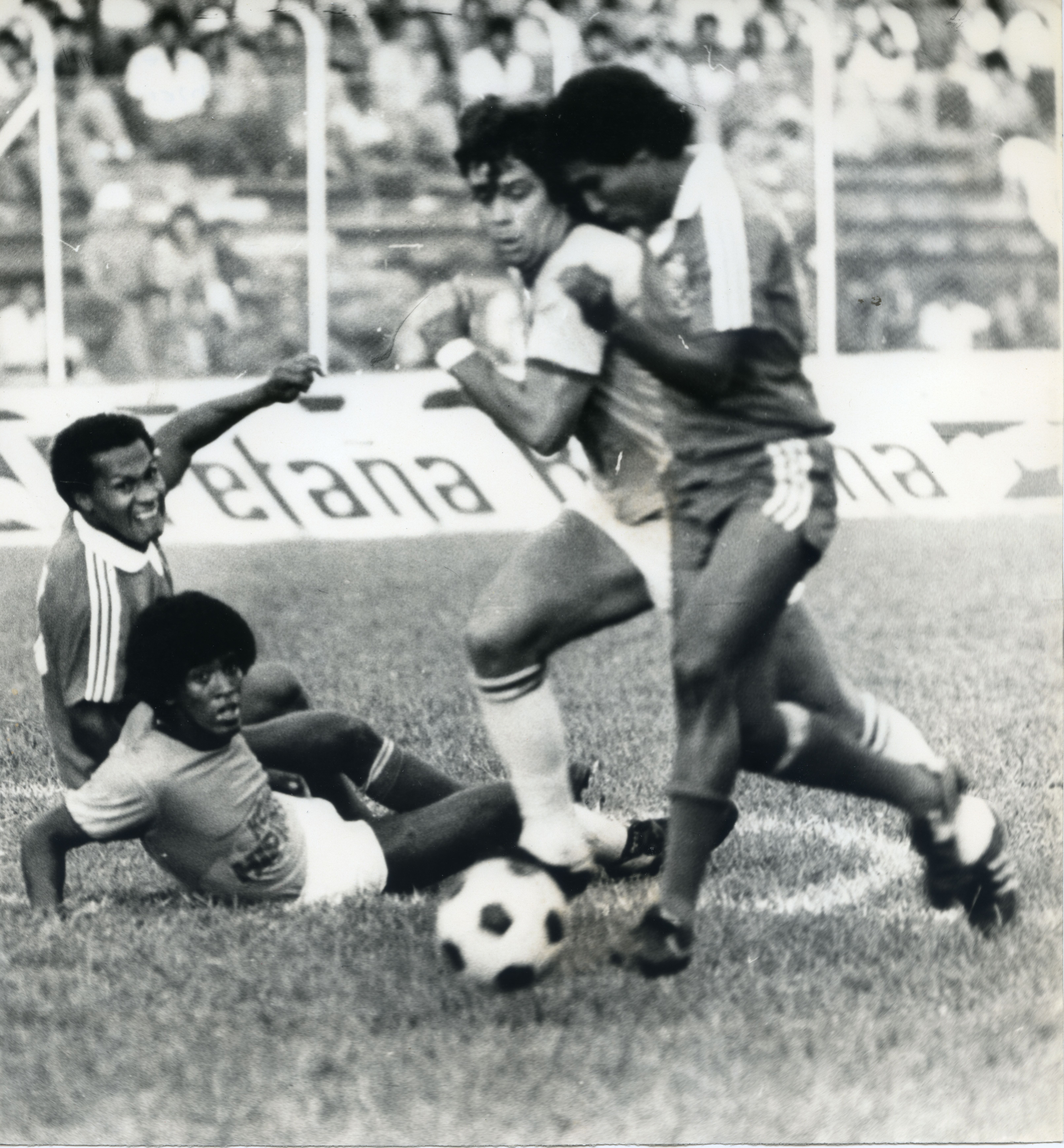 Foto de plano completo de cuatro jugadores, donde se ven dos jugadores en el césped y los otros dos forcejeando por el balón de pie, mientras el balón se ve por delante de ellos