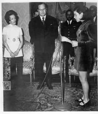 Olga Lucia Angulo y el señor Presidente Misael Pastrana Borrero en una ceremonia en Bogotá