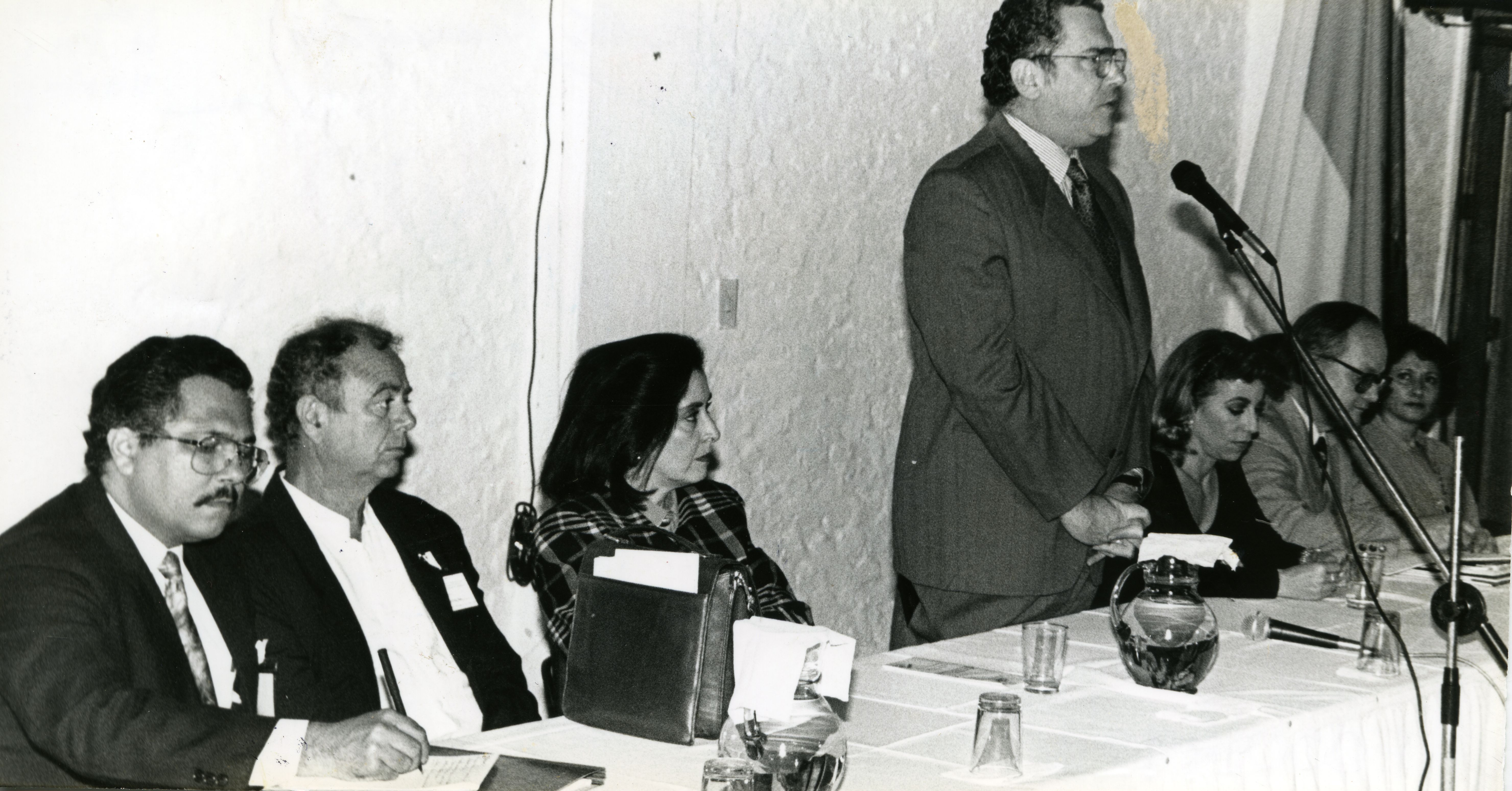 Amparo Bouzas de Holguín, Carlos Holguín Sardi, y Guillermo León Jaramillo, en sala de reuniones