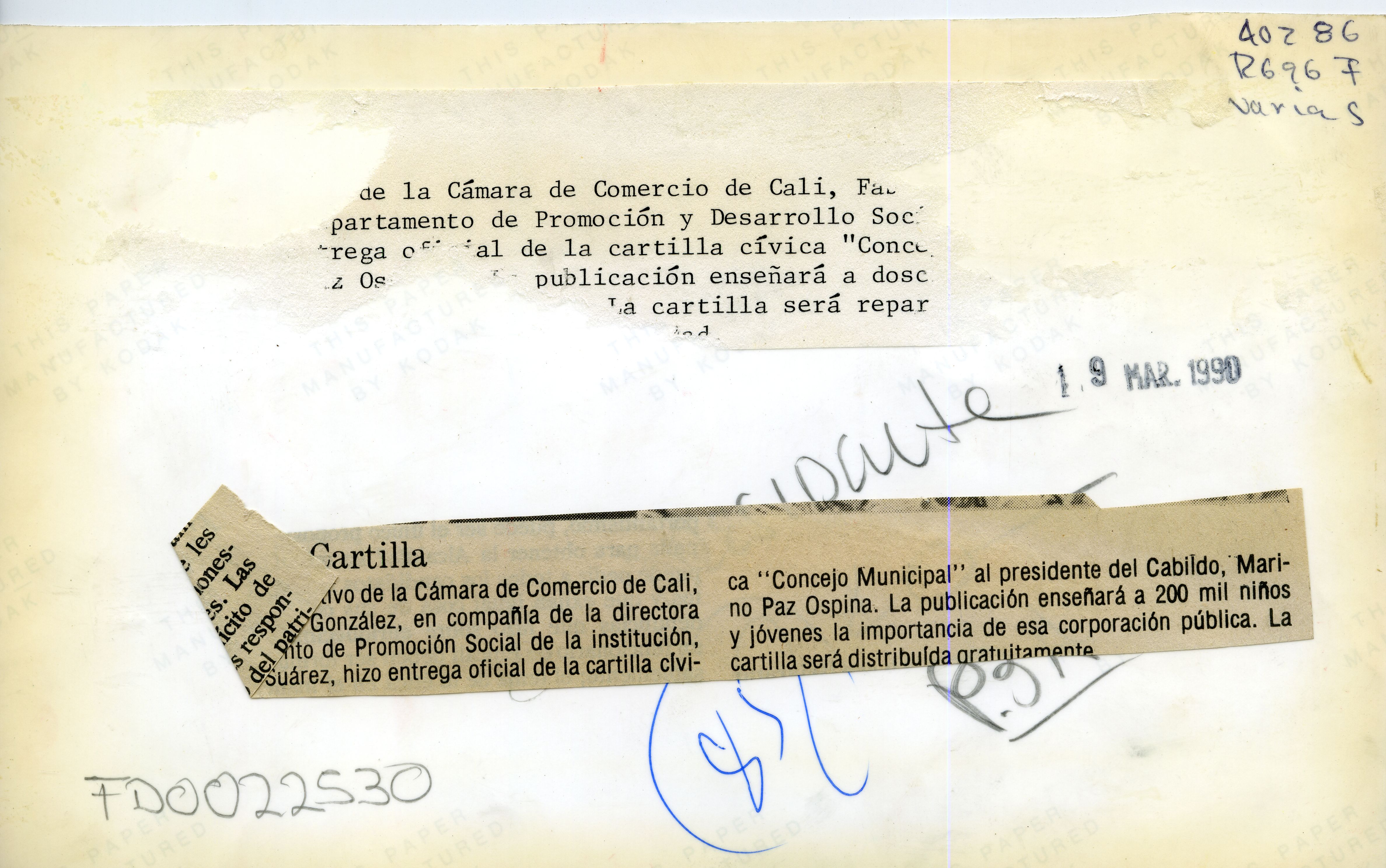Al reverso de la fotografía se anexa escrito: Ejecutivo de la Cámara de Comercio de Cali, Fabio Rodríguez González, en compañia de la directora departamento de Promoción Social de la institución, Suárez, Hizo entrega la cartilla cívica"concejo municipal" al presidente del cabildo, Marino Paz Ospina, la publicación enseñará a 200 mil niños y jóvenes la importancia de esa corpopación pública la cartilla será distribuida gratuitamente