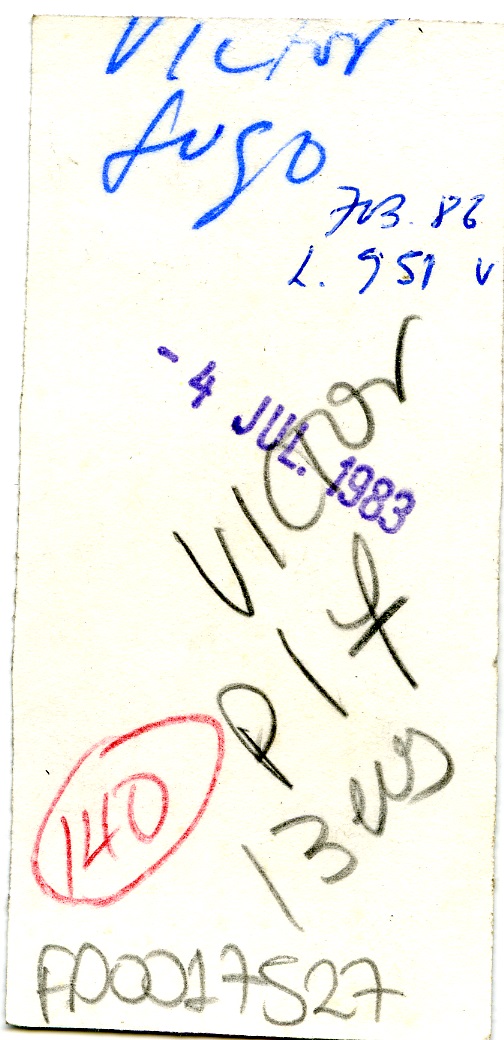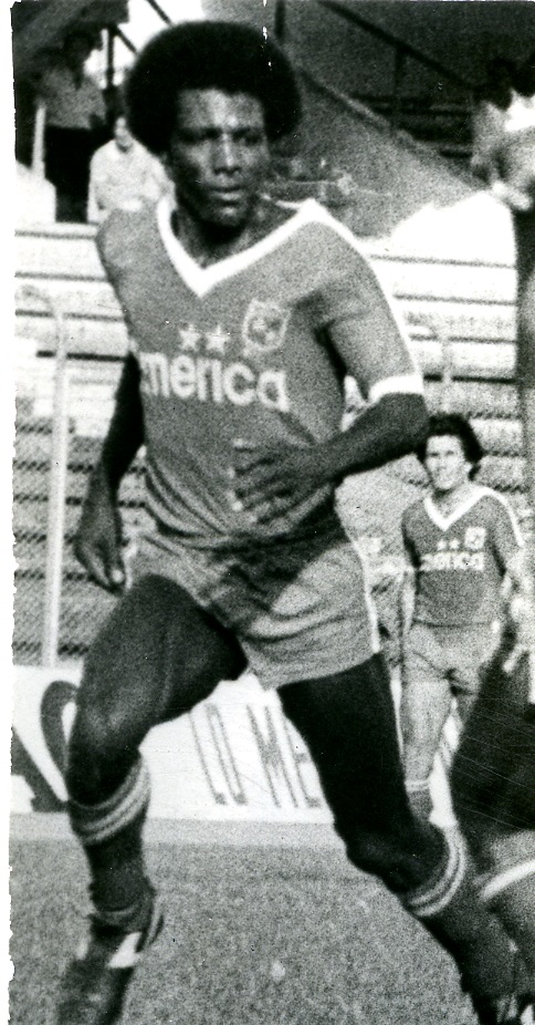 Víctor Jesús Lugo Ortiz, Robles, Jamundí, Valle. Jugador de fútbol del América de Cali. Fue conocido como el “fabricador de penales”, por la cantidad de este tipo de faltas que le pitaron a su favor, durante su carrera deportiva. Anotó 76 goles con el equipo, incluyendo el segundo tanto que le daría a la institución su primer título, en 1979. Participó también en la Selección Jamundí, Selección Valle, Selección Colombia, y varios equipos del Fútbol Profesional Colombiano. Apreciamos a Víctor Lugo corriendo durante el partido. Observamos la camiseta del América con dos estrellas
