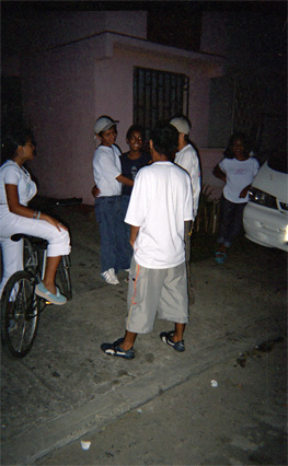 Plano general. Varios jóvenes reunidos en exterior de residencia. Poca iluminación. Exterior noche.