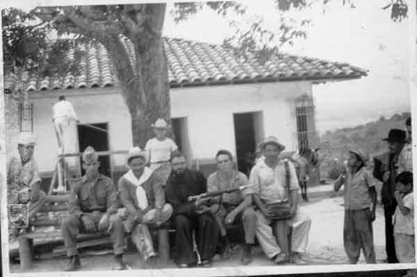 Misioner policia y campesinos de Puerto Molina, en una banca de la Plaza del corregimiento. Obando. Fecha por identificar.