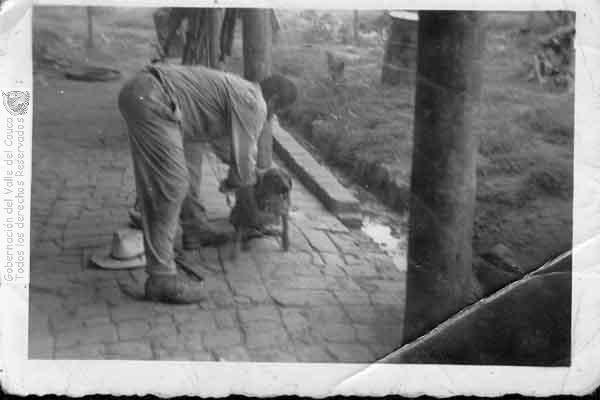 Señor Hernán González amaestrando su mascota. Finca la vereda Alizal. Zarzal, 1950.