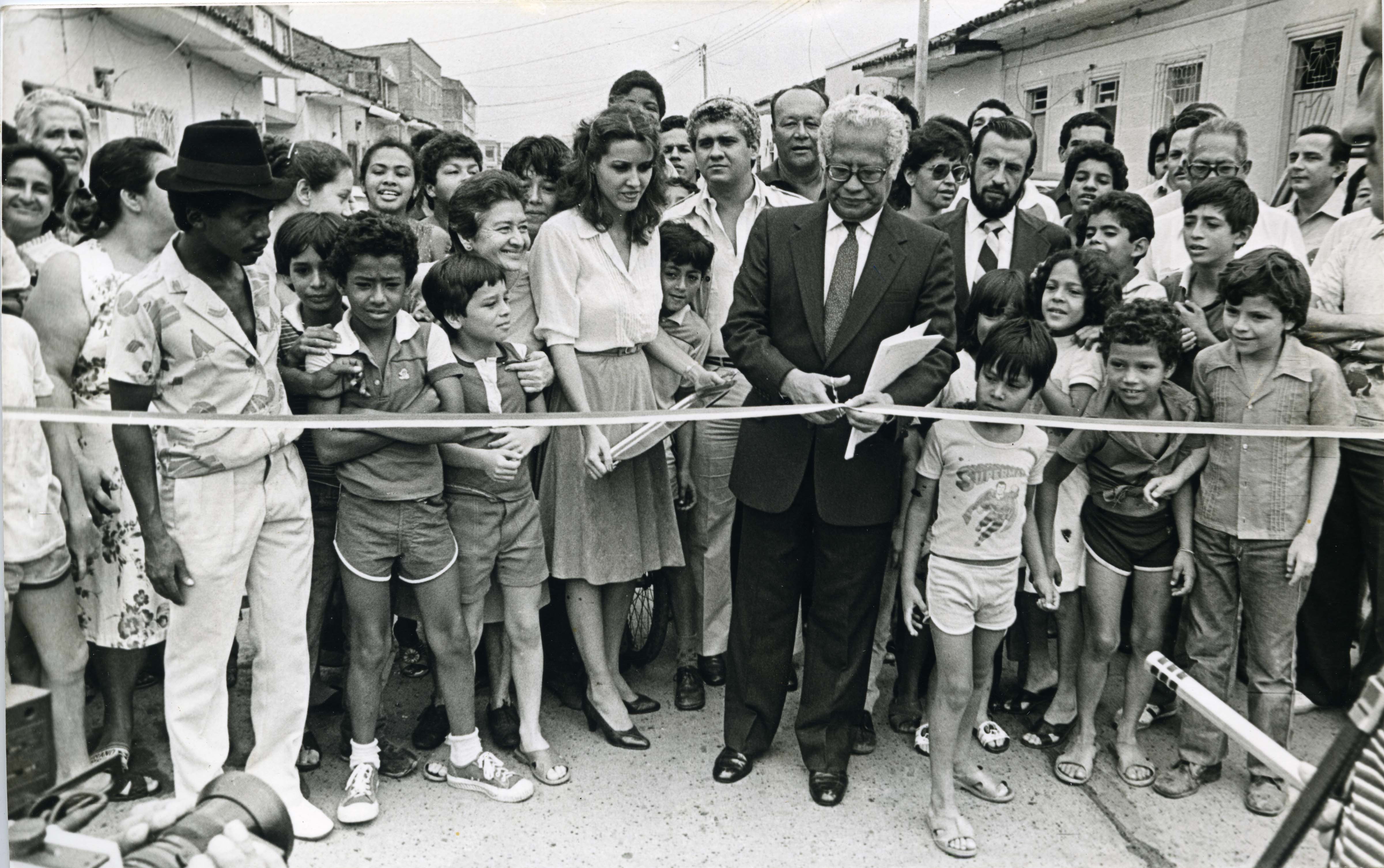 En el pie de foto dice lo siguiente: Inauguración de ampliación de la calle 21 entre calles 8 y 15. Observamos al alcalde de Cali, Julio Riascos, cortando la cinta y un gran número de personas del barrio observan felices