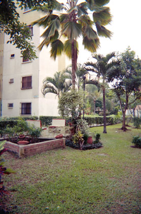 Plano medio contexto. Exterior día. Perspectiva de conjunto residencial en costado superior izquierdo opuesto a parque.
