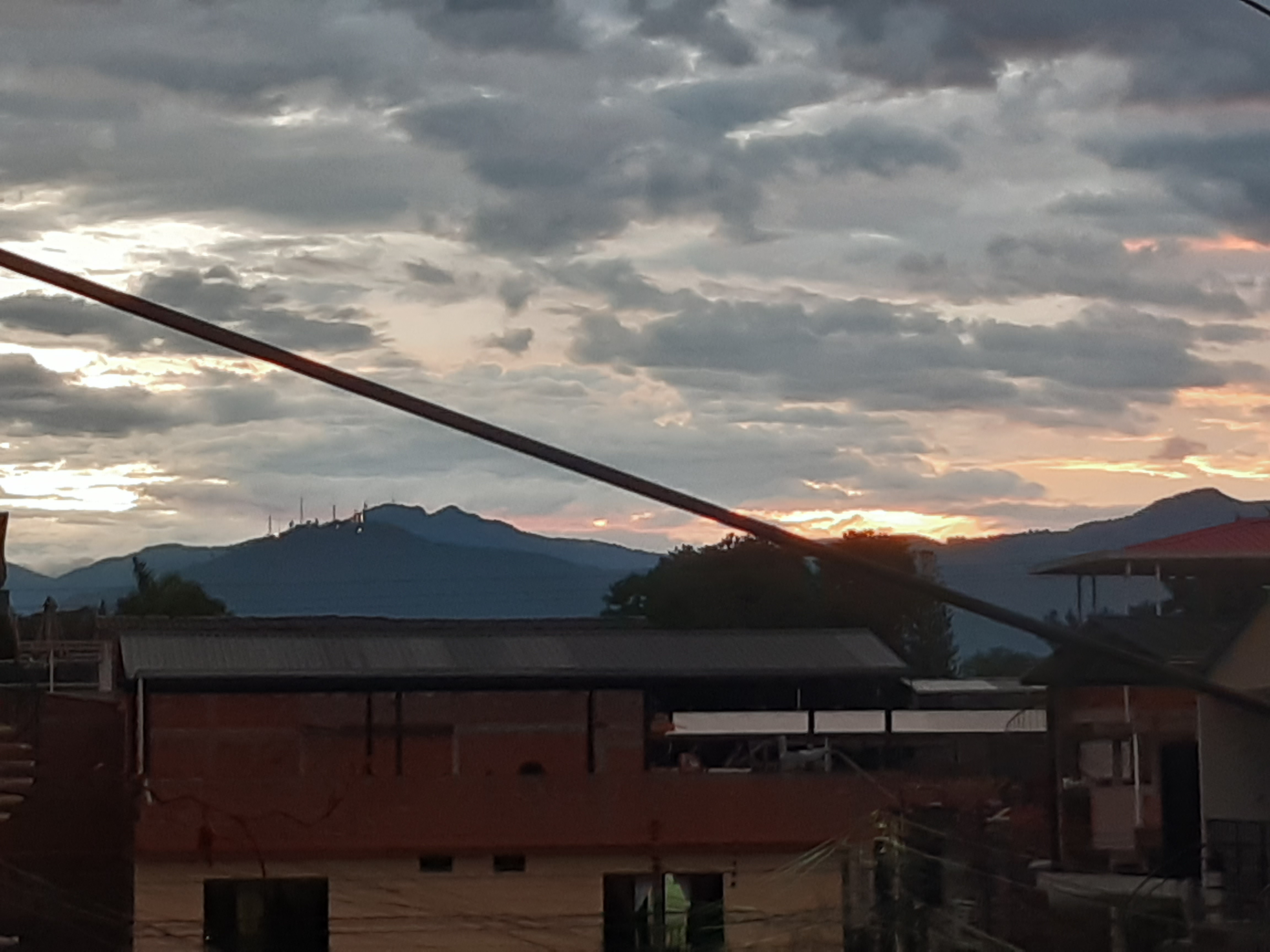 En el horizone se divisan montañas, más cerca algunas casas bajo el atardecer y las nubes.