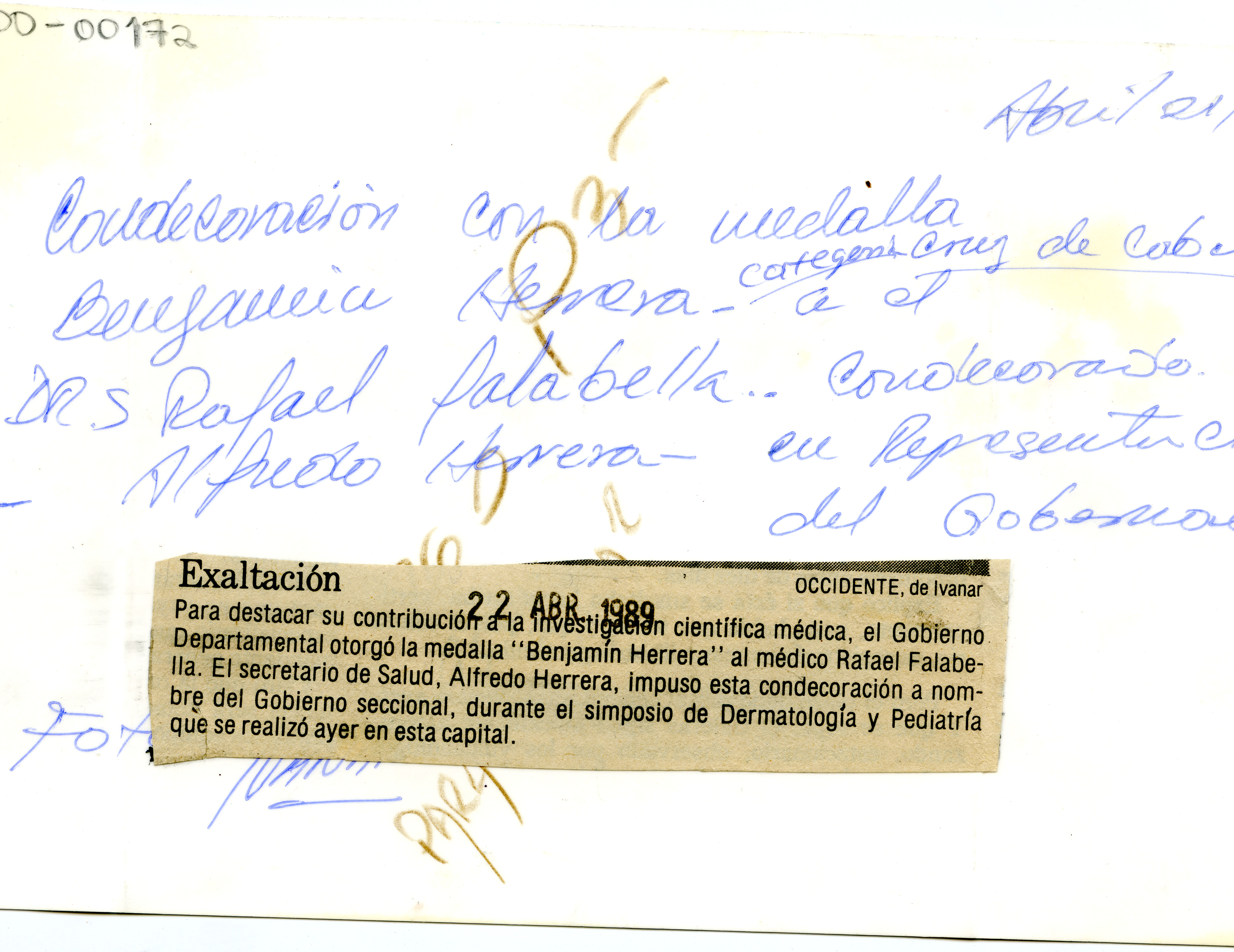 Para destacar su contribución a la investigación científica médica, el Gobierno Departamental otorgo la medalla “Benjamín Herrera”, categoría Cruz de Caballero, al médico Rafael Falabella. El Secretario de Salud, Alfredo Herrera, impuso esta condecoración a nombre del Gobierno seccional. Dr. Rafael Falabella: Profesor Emérito Departamento de Dermatología, Facultad de Ciencias de la Salud - Universidad del Valle. El Archivo del Patrimonio Fotográfico y Fílmico del Valle del Cauca es responsabilidad de la Biblioteca Departamental del Valle Jorge Garcés Borrero, por convenio de cooperación suscrito con la Secretaria del Cultura Departamental, con el fin de aunar esfuerzos para su conservación, preservación y divulgación del Archivo entre la comunidad Vallecaucana, especialmente entre los estudiantes e investigadores que visitan la Biblioteca, propiciando el uso y consulta permanente. La universidad Icesi es un colaborador en el proceso de difusión, facilitando la tecnología que permite la consulta de las imágenes.