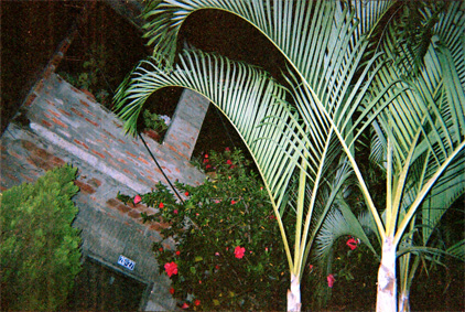 En primer plano palmas. Al fondo residencia en obra negra. Plano medio. Toma diagonal en contrapicado.