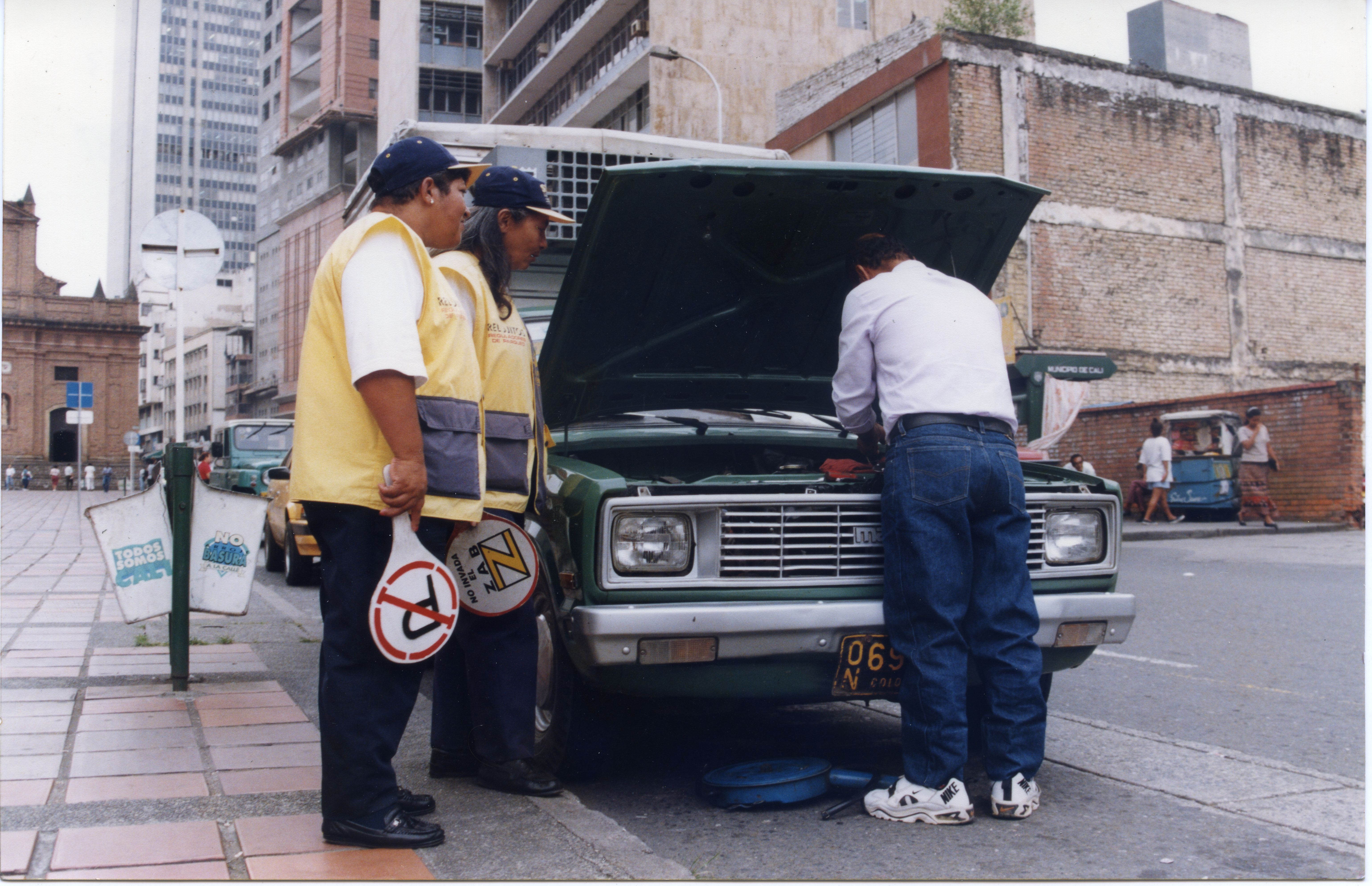 Camioneta siendo revisada por una persona, al lado de él se observan Los "Relojitos". Al reverso de la fotografía se anexa recorte: UNA DESTACABLE LABOR VIENEN DESEMPEÑANDO LOS RELOJITOS, PROGRAMA LIDERADO POR LA SECRETARÍA DE TRÁNSITO Y TRANSPORTE MUNICIPAL. ENTRE SUS FUNCIONES ESTÁ LA DE VELAR POR LA APLICACIÓN DE LAS NORMAS DE TRÁNSITO, POR PARTE DE LOS CONDUCTORES, EN ESTE CASO. ESTA LABOR DEBE ESTAR COMPLEMENTADA CON EL CUMPLIMIENTO DE LAS OBLIGACIONES SALARIALES.