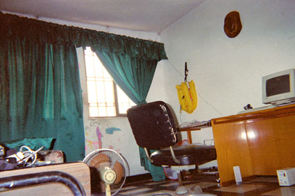 Plano medio. Imagen tomada en el interior de la habitación del autor, donde se puede observar algunos elementos decorativos del lugar. Al extremo izquierdo una cortina de color verde y al derecho un escritorio con un computador se destacan.