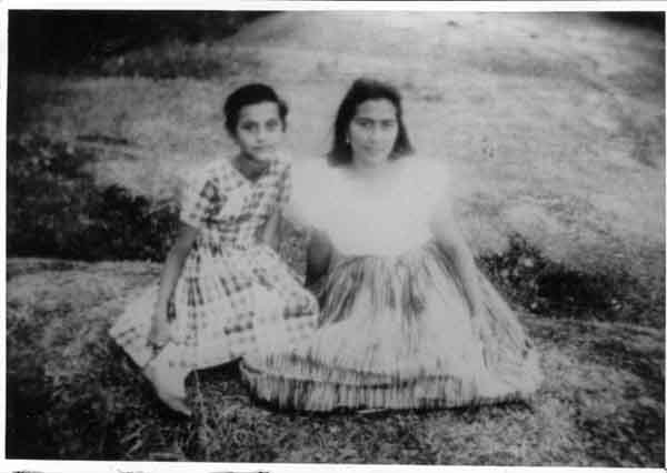 Omaira y Orfilia Montero. Se observa la moda del momento: faldas amplias, resaltando la cintura en tela escocesa, de grandes cuadros de colores, blusa en tono claro, escote bandeja que dejaba al descubierto el cuello y los hombros. Vijes, C. 1955.