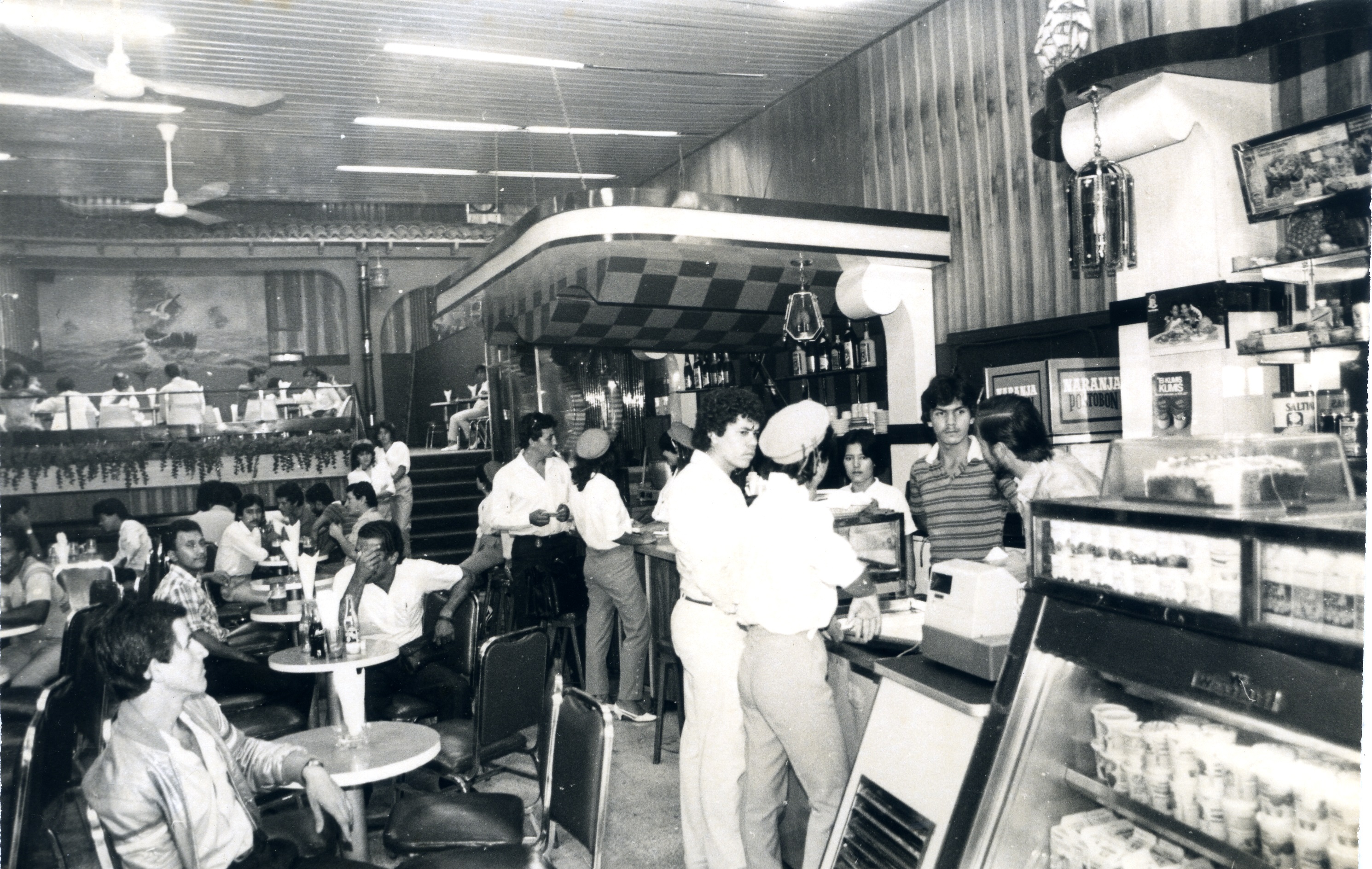 Se observan los interiores de la heladería y la fuente de soda, al costado izquierdo la barra y los empleados del lugar. Se observa gran concurrencia al establecimiento, ubicado en la calle 13 en la parte baja del Edificio Santa Librada, en el centro de la ciudad.