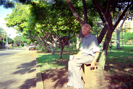 Plano medio. En la imagen se puede apreciar un hombre de edad adulta sentado en una banca junto a un árbol, al extremo izquierdo una vía pavimentada. Imagen tomada con luz día.