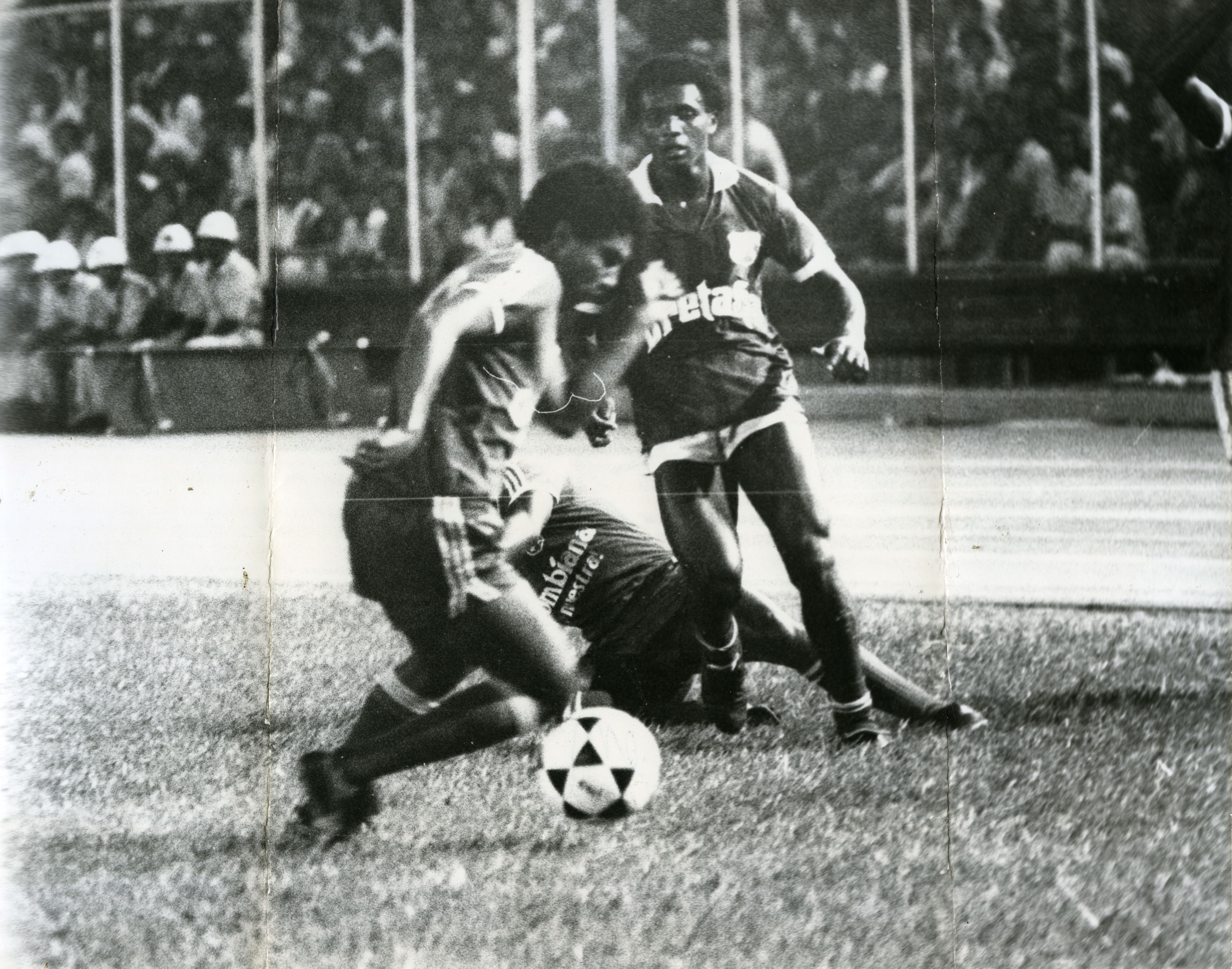 Partido de fútbol entre los equipos América y Deportivo Cali jugado en el estadio Pascual Guerrero. El partido terminó a favor del Deportivo Cali 3-1. Se aprecia al jugador Jairo Ampudia elude jugador caleño y Redín observa. Observamos público en la tribuna
