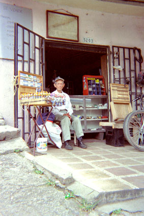 Plano medio. Imagen tomada en exterior, donde se puede apreciar la fachada de un local comercial, junto al cual hay un hombre de edad adulta sentado con un puesto de venta de dulces.