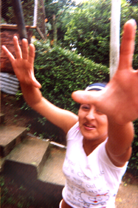 Plano medio. Imagen tomada en exterior, donde se aprecia una mujer joven con sus brazos extendidos hacia la cámara. Al fondo vegetación abundante.