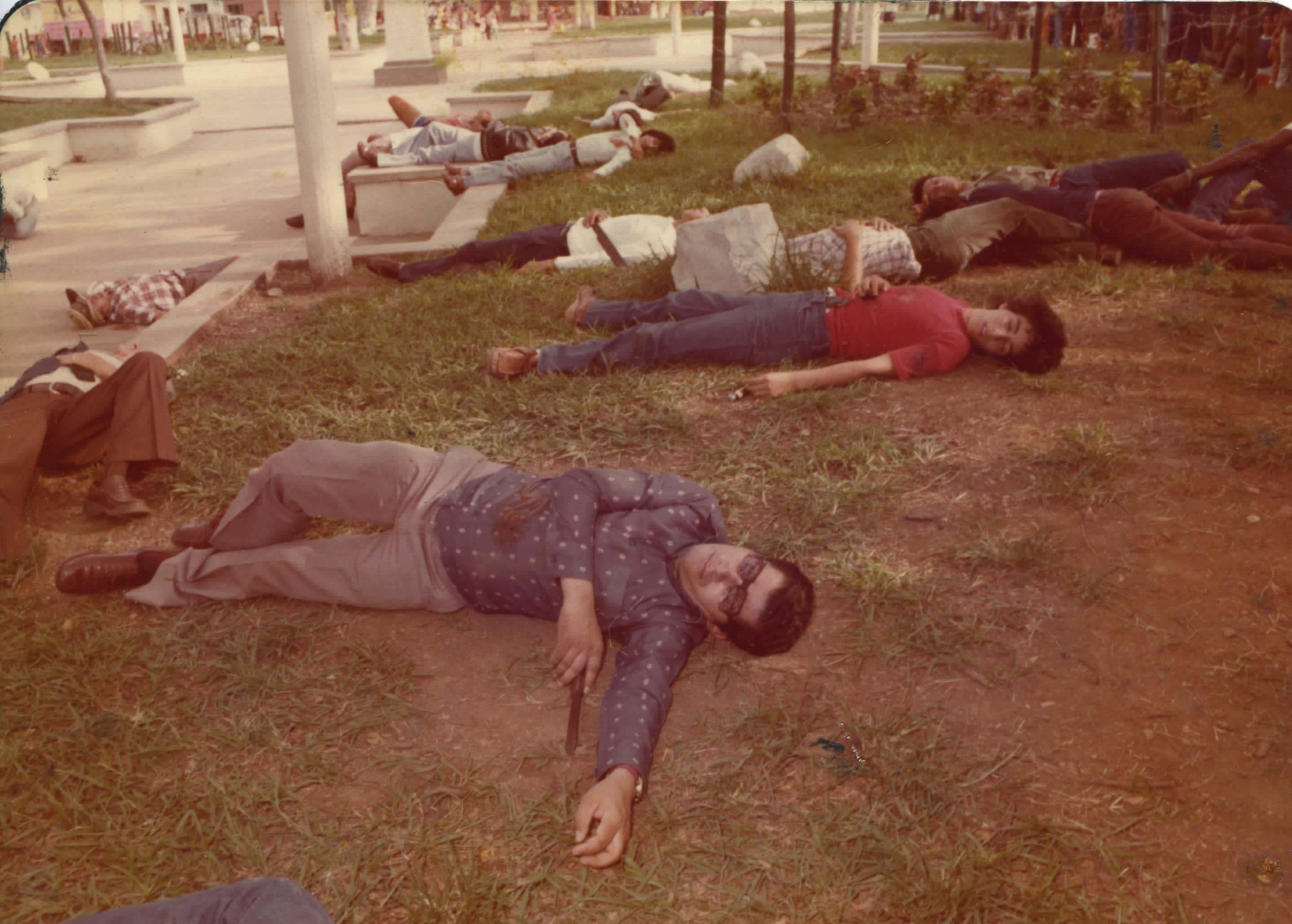 Juan Antonio Jiménez Ceballos y varios actores en escena. Los observamos acostados en el suelo del Parque Popular, actuando en el Filme Cóctel Latinoamericano