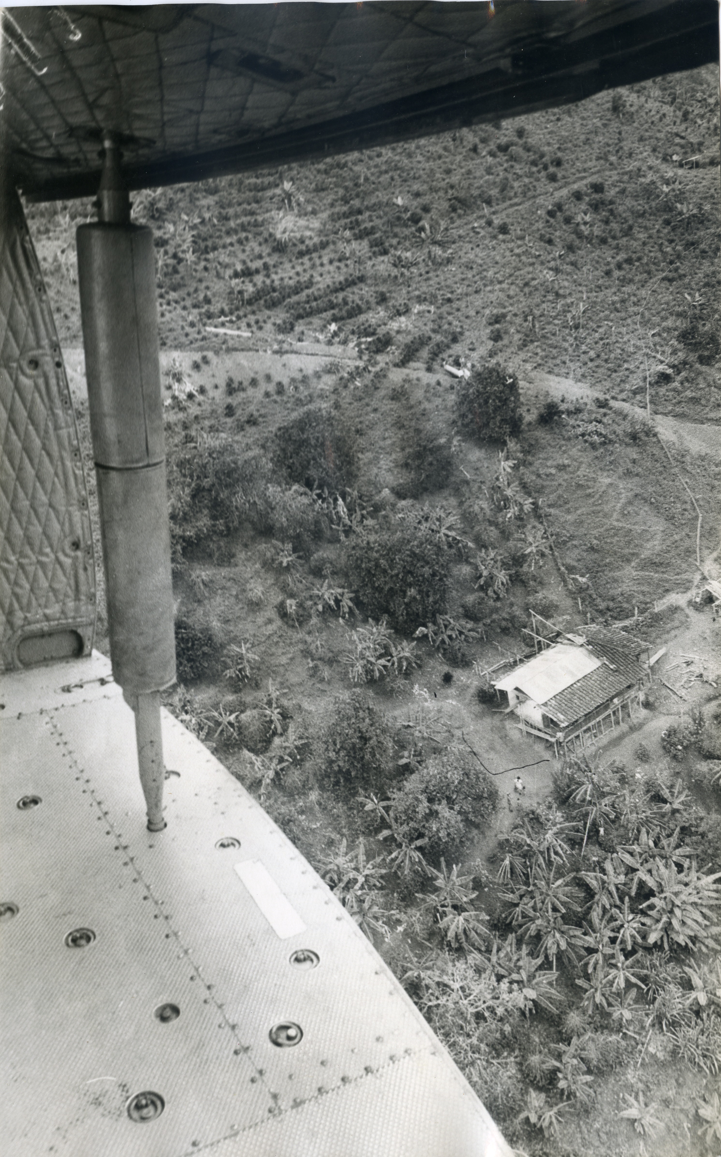 Vista desde un helicóptero del proceso de construcción del alcantarillado y el acueducto de Sevilla. Se observa una casa rural al fondo.