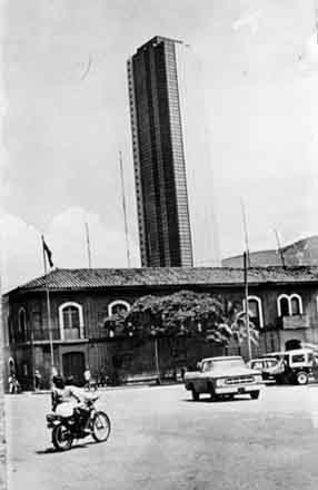 Antiguo edificio de la Policía Nacional. Se aprecia al fondo el edificio Torre de Cali en construcción. Santiago de Cali, 1985.