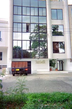Plano medio. Imagen tomada en exterior, donde se puede apreciar la fachada de un edificio de color blanco con ventanas tipo espejo en el centro de la fachada.