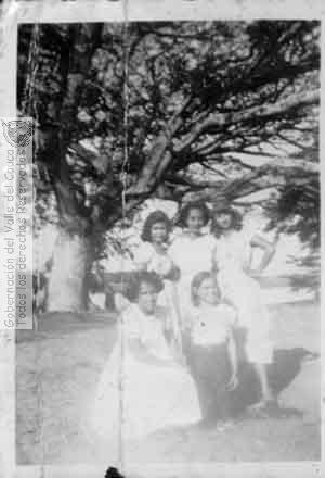 Elizabeth Reyes, Ana Carolina Álvarez, Aida Ruth Álvarez, con hermosso vestidos domingueros de paseo por el parque. Guacari. C. 1950.