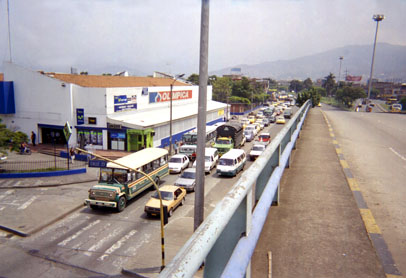 Plano general. Exterior día. División de calle formando triángulo isóceles por separador. Exceso de carros en costado izquierdo.