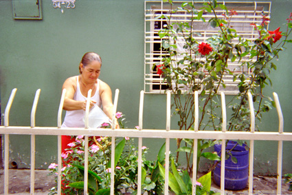 Plano medio de una mujer en un jardín cuidando de las plantas, se destaca en el extremo derecho un rosal con flores de color rojo oscuro. Al fondo la fachada de color verde y al frente una reja de color blanco.