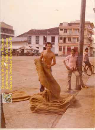 Plaza Principal de El Aguila, Horacio Diez Ramírez, al fondo se observan las casas que se quemaron en el incendio de 1991 y el edificio de Pedro de Agudelo. El Aguila C, 1974.
