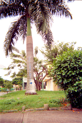 Plano general. Sobresale palmera de gran tamaño en la cual se encuentra pintada la palabra peluquería seguida de una flecha a la derecha. Al lado derecho arbusto. Al fondo residencias.