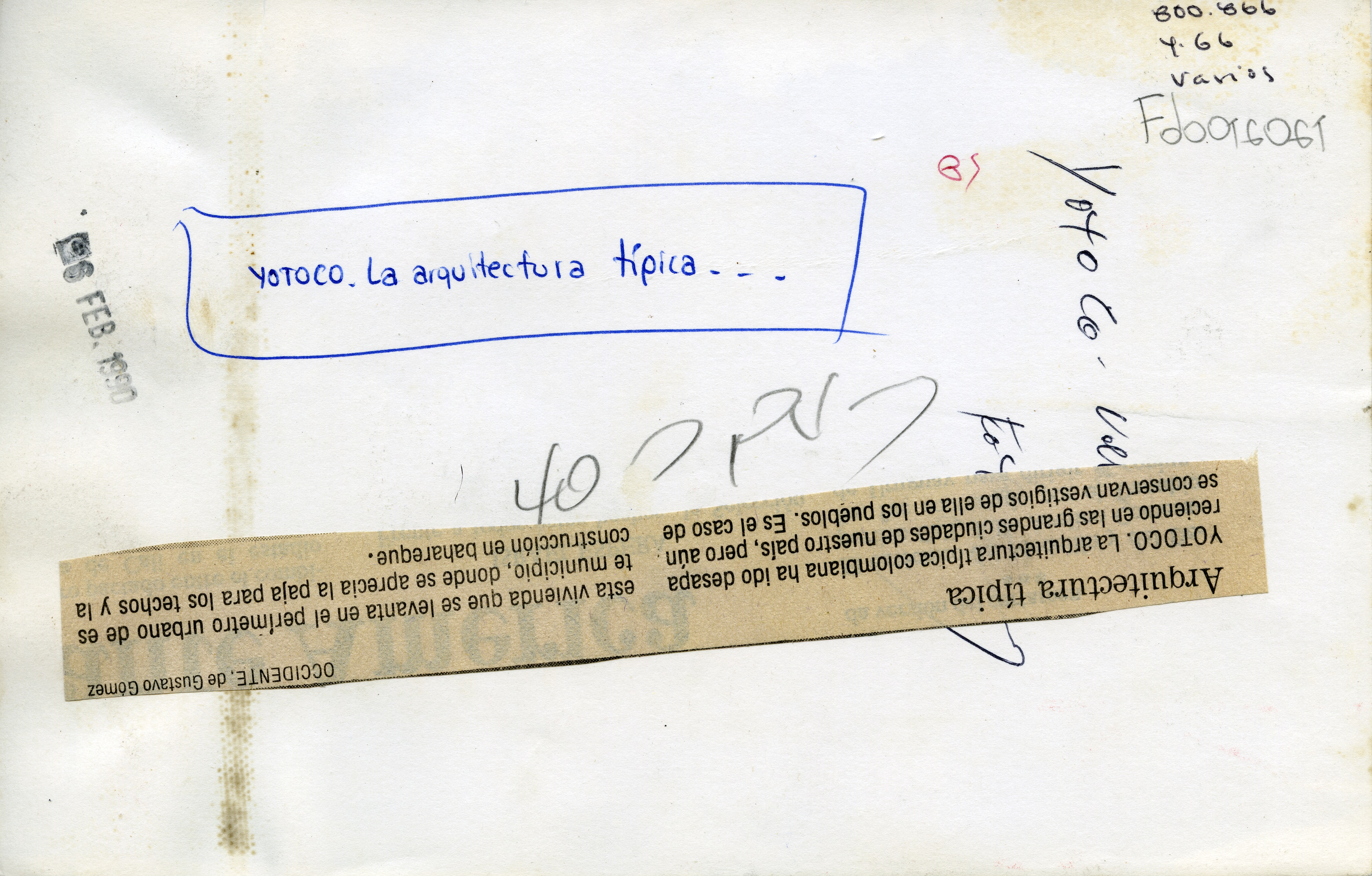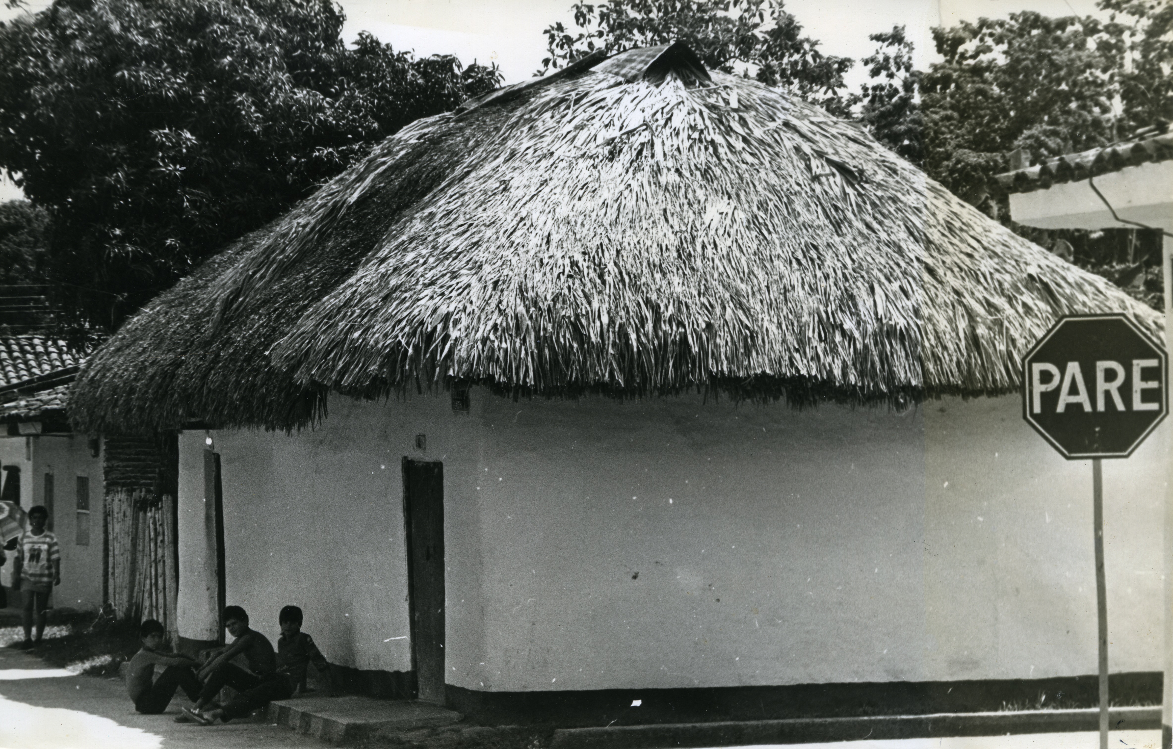 Escorzo de aspecto de casa antigua esquinera de bahareque o bareque de color blanco, el techo posiblemente elaborado con material natural puede ser hoja de palma seca, caña o Yarumo, se observa jovenes sentados en el anden de la casa