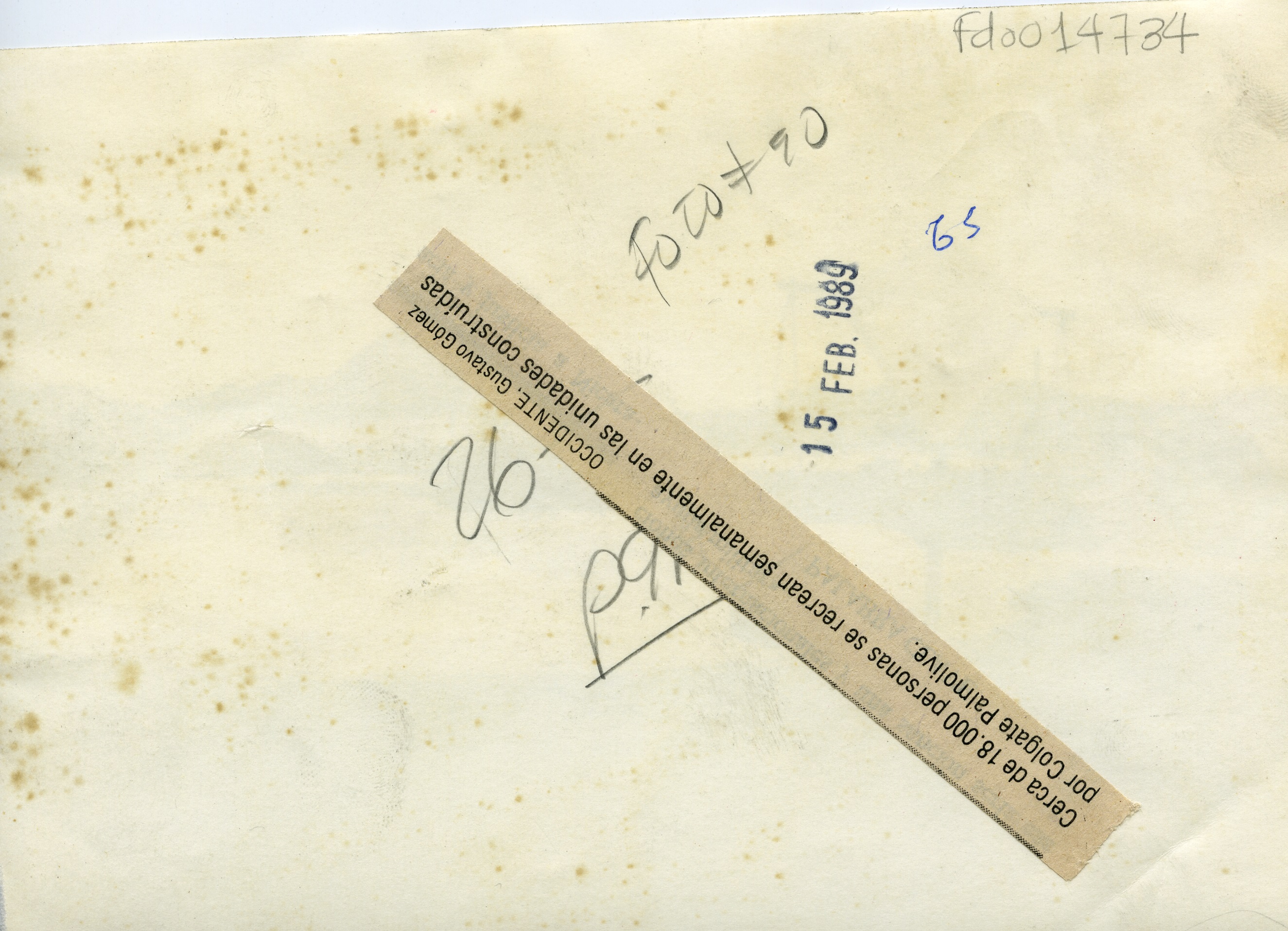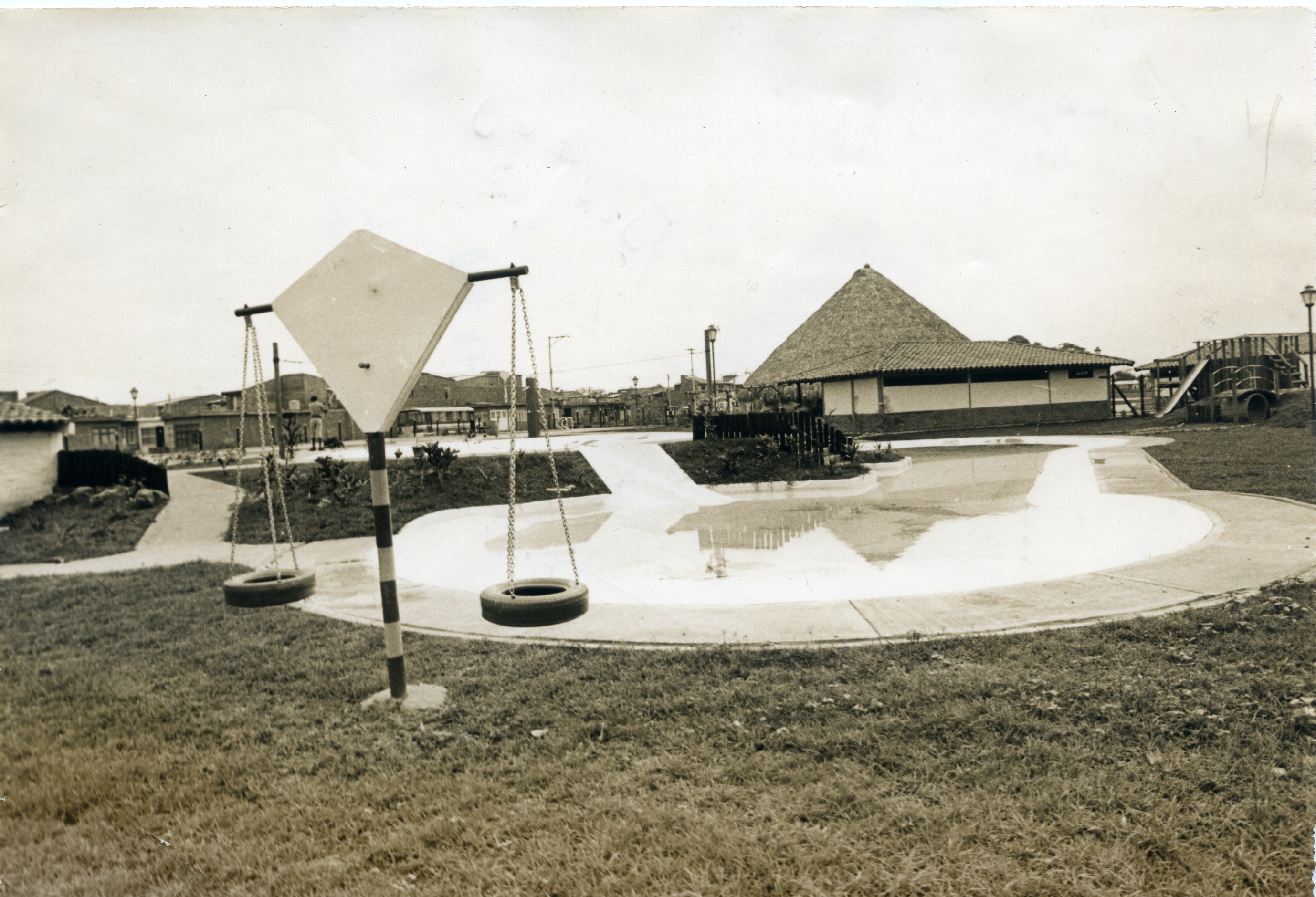 Al reverso de la fotografía se anexa el pie de foto del periódico: "Cerca de 18.000 personas se recrean semanalmente en las unidades construidas por Colgate Palmolive." Se observa la piscina infantil y al lado un columpio con llantas, al fondo la piscina de adultos y al costado izquierdo la caseta.