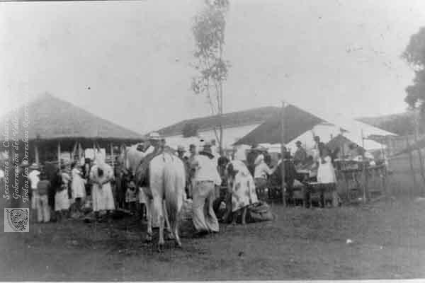 s. n. & s. n. (1946). Gregorio Peña, Mercedes Quintero y María Castillo en la plaza de mercado & 102740. LA CUMBRE: Biblioteca Departamental Jorge Garces Borrero.