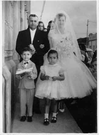 Matrimonio de Julio Caicedo Paláu y Lucero Caicedo Gómez. salida de la capilla del orfanato de la Sagrada Familia. Tuluá, 1957.