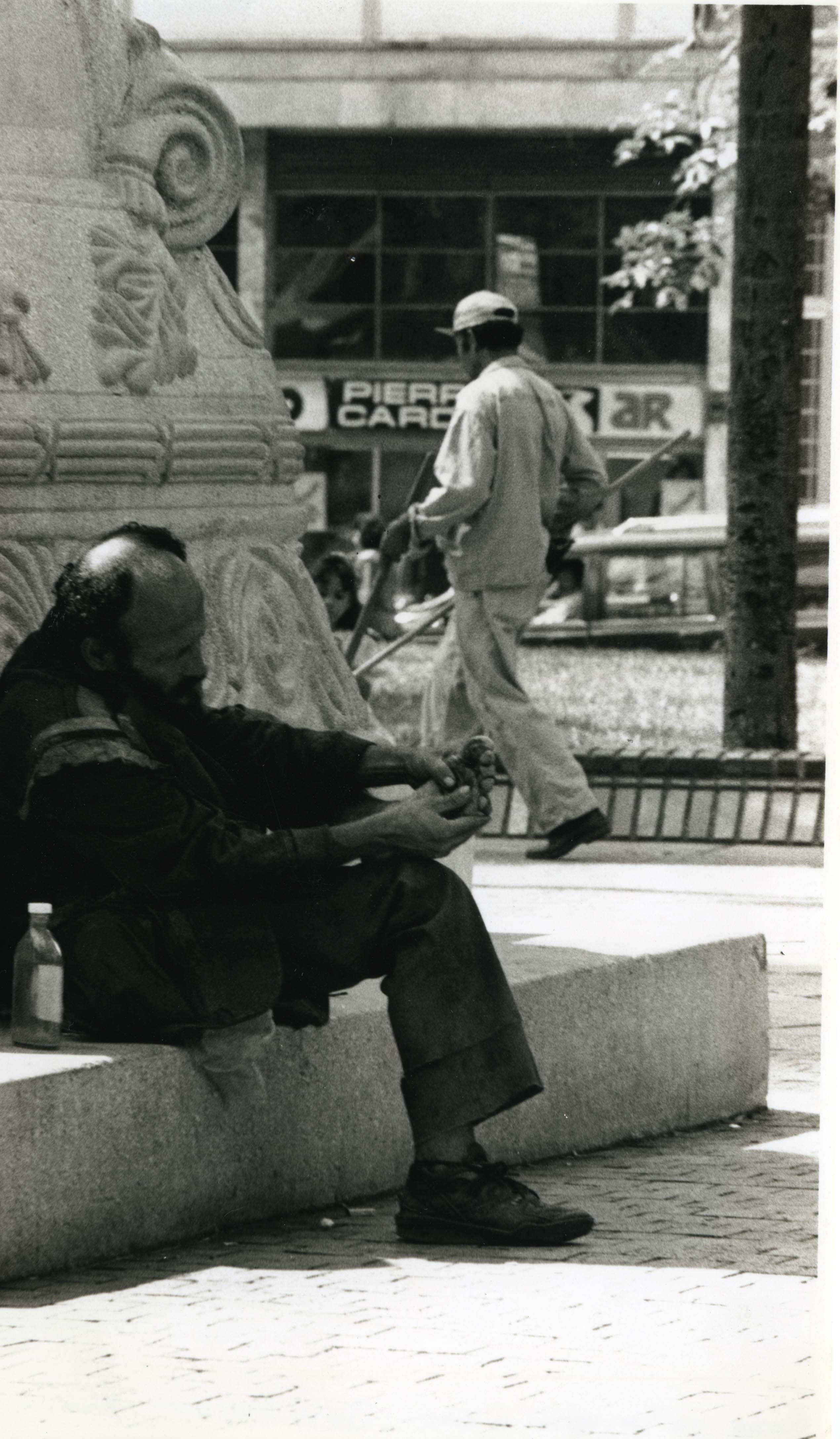 Señor descansando en la estatua de Joaquín de Caicedo & Cuero en la Plaza de Caicedo en Santiago de Cali <El Archivo del Patrimonio Fotográfico y Fílmico del Valle del Cauca es responsabilidad de la Biblioteca Departamental del Valle Jorge Garcés Borrero, por convenio de cooperación suscrito con la Secretaria del Cultura Departamental, con el fin de aunar esfuerzos para su conservación, preservación y divulgación del Archivo entre la comunidad Vallecaucana, especialmente entre los estudiantes e investigadores que visitan la Biblioteca, propiciando el su uso y consulta permanente. La universidad Icesi es un colaborador en el proceso de difusión, facilitando la tecnología que permite la consulta de las imágenes.