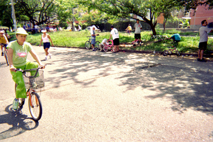 Plano Medio. Imagen tomada en exterior, con luz de sol. Una mujer de edad adulta, transita en bicicleta, vestida con una sudadera color verde. Al fondo un separador vial con un árbol que proyecta su sombra sobre la vía. Al fondo la fachada de algunas edificaciones.
