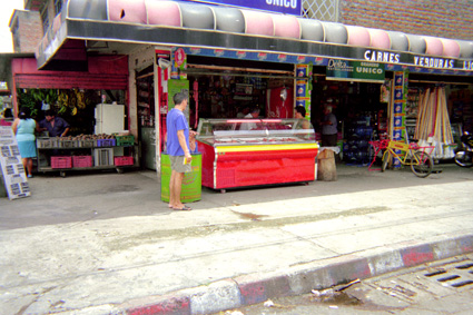 Barona Osorio, É. (2005). Fachada de una carnicería con un parasol de color rojo y negro y una nevera de color rojo, junto a ella un hombre de pie. Santiago de Cali: Biblioteca Departamental Jorge Garces Borrero.