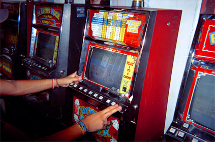 Primer plano. En la imagen tres máquinas tragamonedas. Sobresale la del centro en la cual una persona se encuentra jugando.