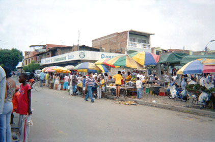 Plano general. Exterior día. Perspectiva lineal. Perspectiva de mercado en formación triangular. Diversidad de sujetos y elementos en escena.