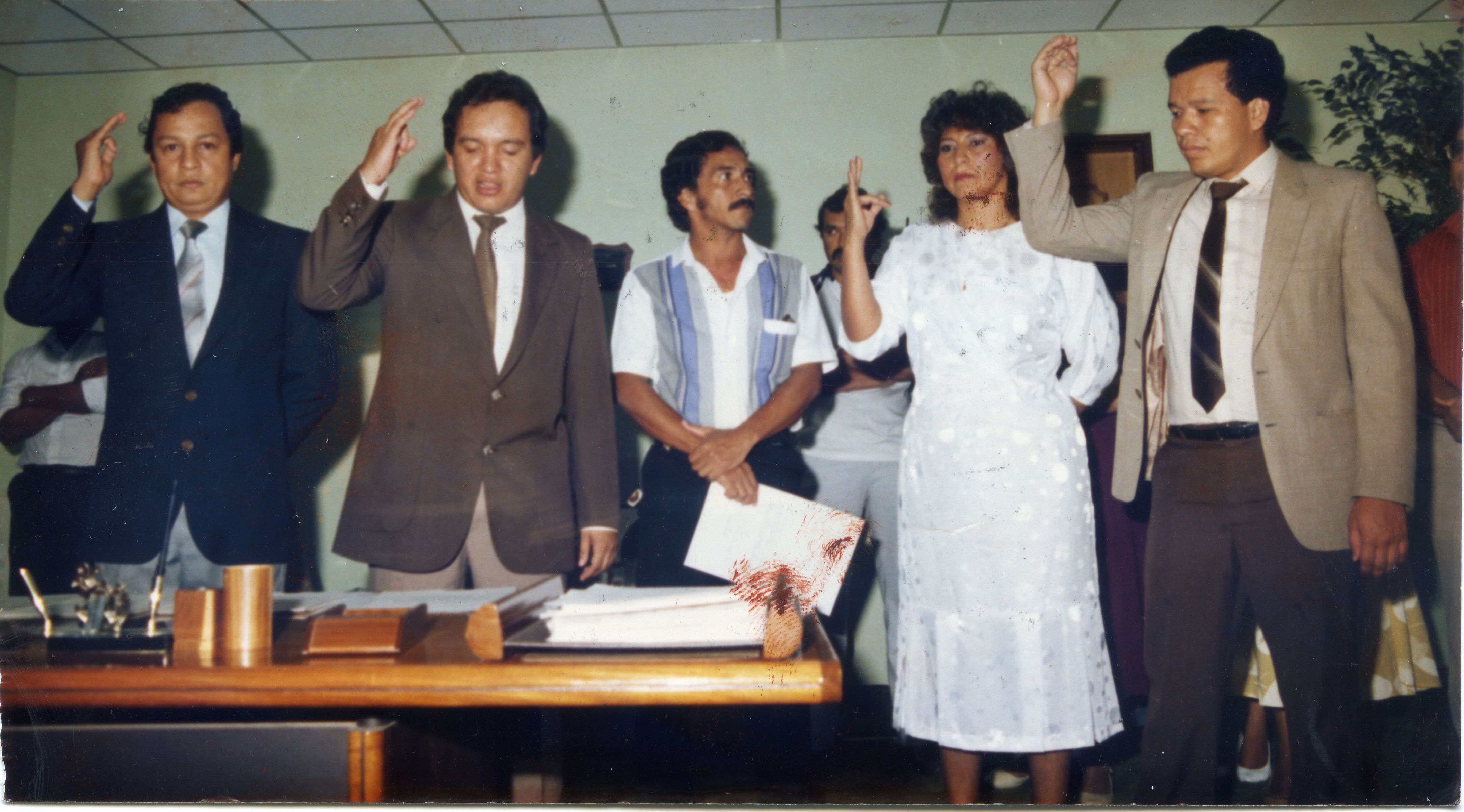 | dc.description.abstract | En la fotografía podemos observar a algunos funcionarios municipales de Yumbo tomando posesión de sus nuevos cargos públicos. Al reverso de la fotografía se anexa recorte: "La gráfica registra el momento de posesión de los nuevos funcionarios de este municipio designados por el Concejo local. De izquierda a derecha, Misael Armando Espinosa, tesorero; el alcalde, Jairo Romero quien toma el juramento, el secretario de Gobierno, Guillermo Rodallega; la personera, Italia Castillo y el contralor reelegido, Luis Alberto Villarreal." | spa |