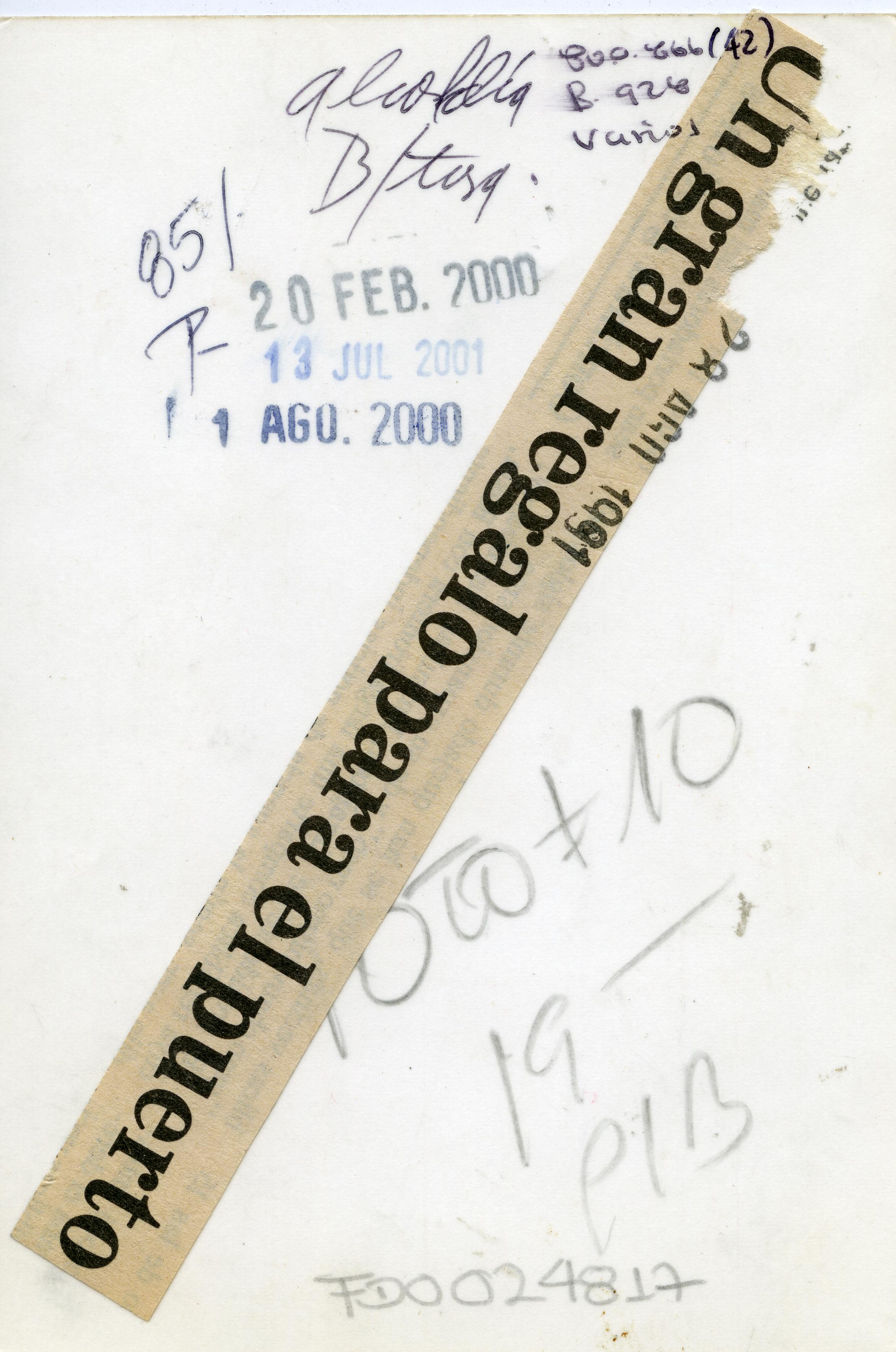 Al reverso de la fotografía se anexa recorte: Un gran regalo para el puerto