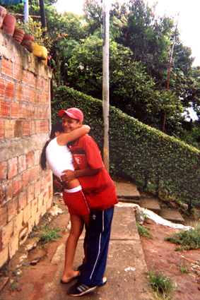 Plano medio. Imagen tomada en exterior, donde se aprecia un hombre joven abrazado a una joven. Al extremo izquierdo un muro de ladrillo a la vista y al fondo vegetación abundante.