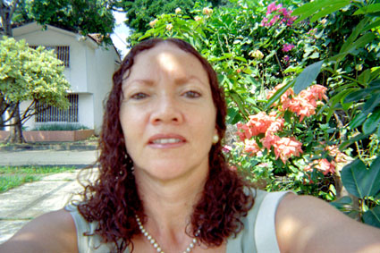 Primer plano de una mujer adulta, con sus brazos extendidos y su rostro dirigido hacia la cámara. Al fondo algunas plantas con flores y la fachada de una vivienda.