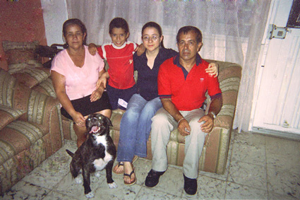 Plano general retrato de familia, interior de la sala de la casa. Se destaca el perro como miembro de la familia.