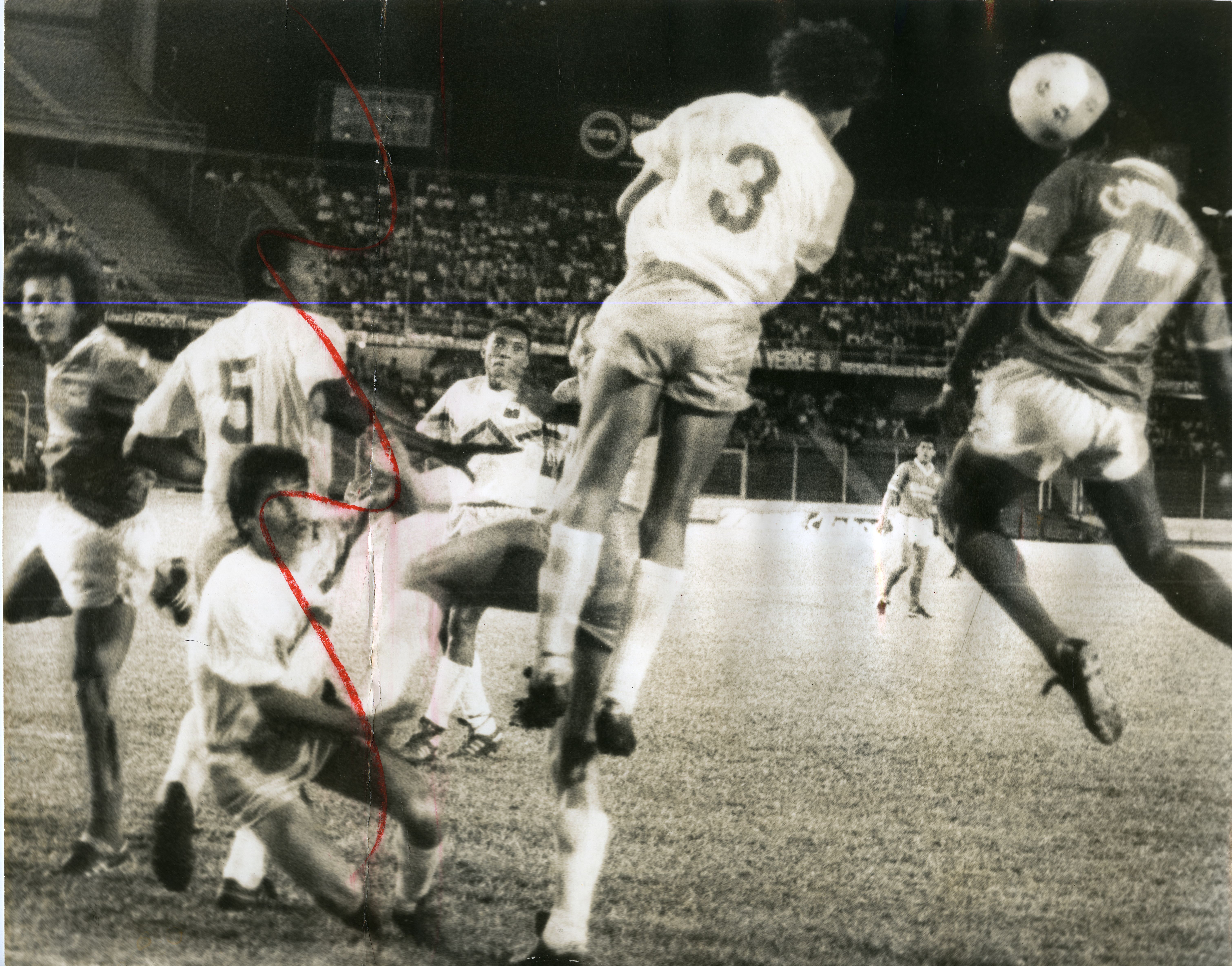 Partido de fútbol entre los equipos colombianos, Deportivo Cali y el Bucaramanga, realizado en el Olímpico Pascual Guerrero. En el campo de juego se observan siete jugadores en el área de los búcaros en disputa por el balón