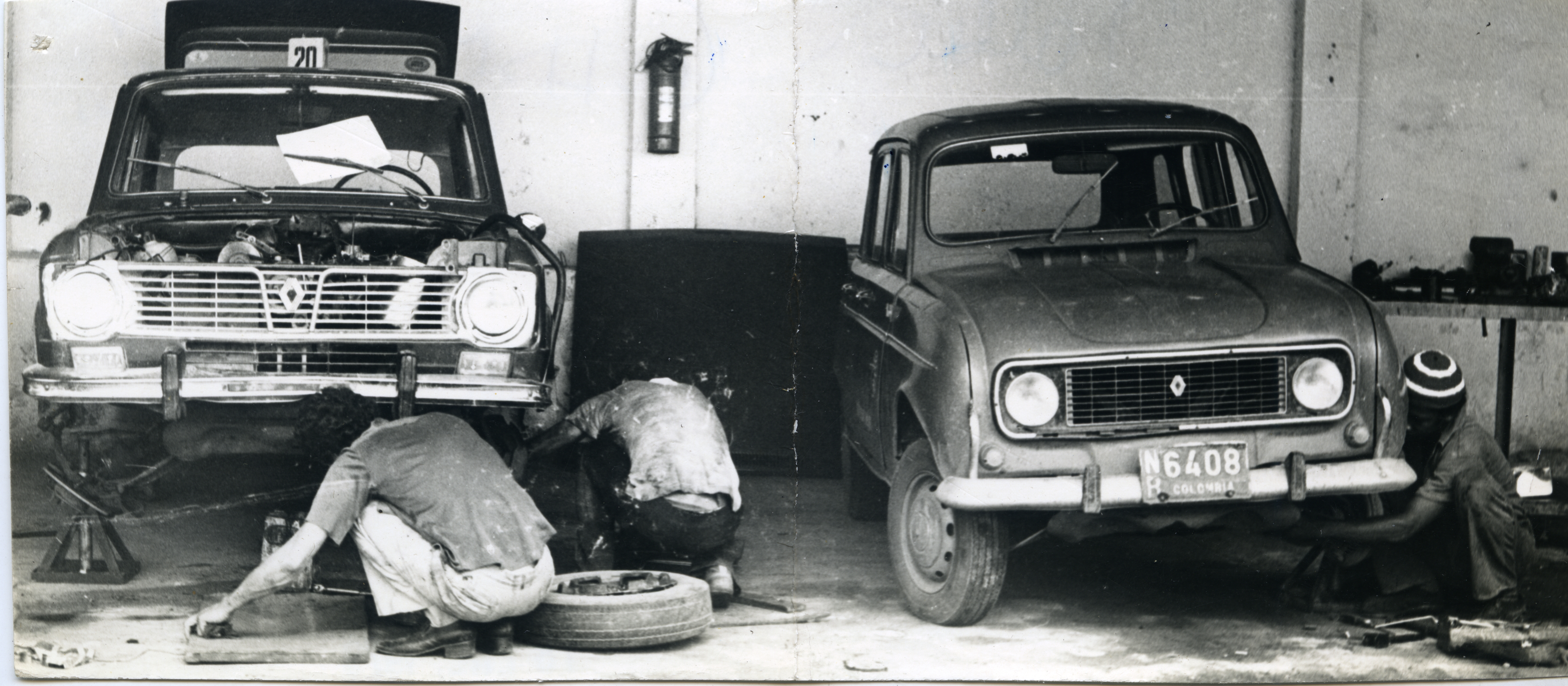 Se evidencia tres mecánicos realizando arreglos a dos vehículos